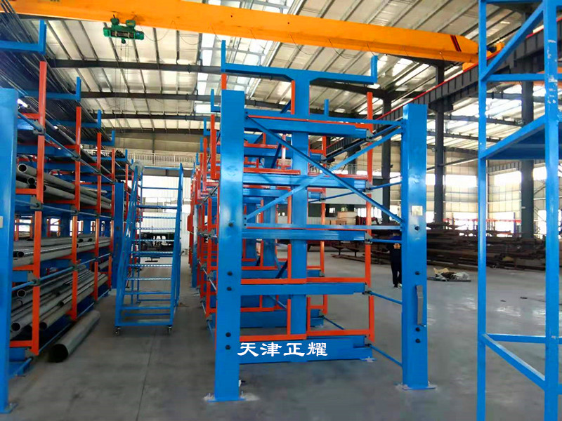 管材倉庫擺放圖片伸縮懸臂式貨架案例現(xiàn)場航吊取貨