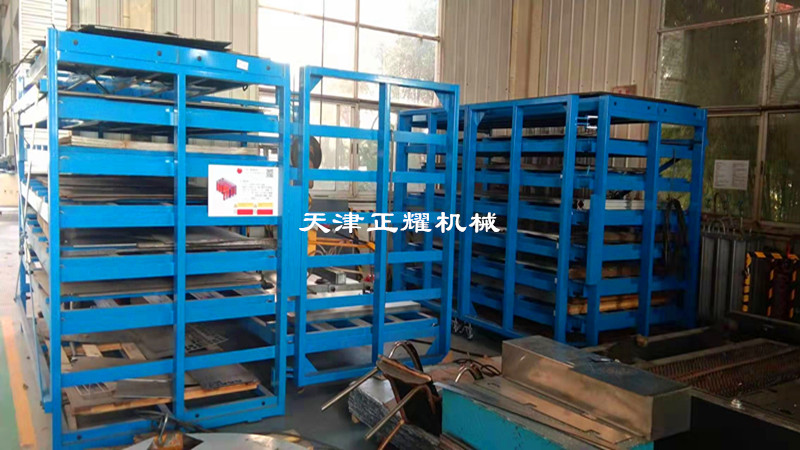 鋼板存放架采用抽屜式結(jié)構(gòu),6米以下的板材拉出式抽屜,每層承重3噸,6米板材采用手搖式抽屜結(jié)構(gòu),每層抽屜單人單手搖出使用承重5噸,層數(shù)4-8層,每層存放一種規(guī)格的板材方便存取不用挪動(dòng)倒垛了,抽屜拉出吊車直接吊裝板材到激光切割機(jī)上完成下料工作,節(jié)省時(shí)間人工,提高工作效率,節(jié)省人工成本。